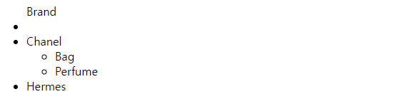 | <ul> Brand <li></li> <li>Chanel <ul> <li>Bag</li> <li>Perfume</li> </ul> </li> <li>Hermes</li> </ul> |