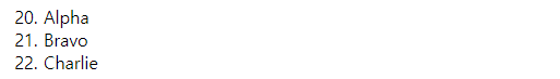 | <ol start="20"> <li>Alpha</li> <li>Bravo</li> <li>Charlie</li> </ol> |