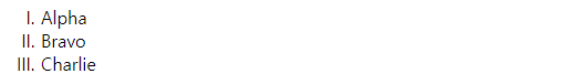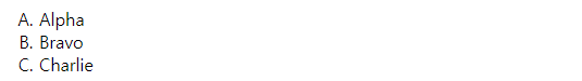 | <ol type="A"> <li>Alpha</li> <li>Bravo</li> <li>Charlie</li> </ol> |
