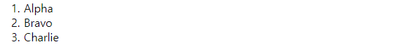 | <ol> <li>Alpha</li> <li>Bravo</li> <li>Charlie</li> </ol> |
