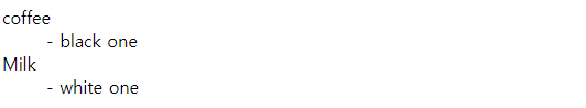 | <dl> <dt>coffee</dt> <dd>- black one</dd> <dt>Milk</dt> <dd>- white one</dd> </dl> |