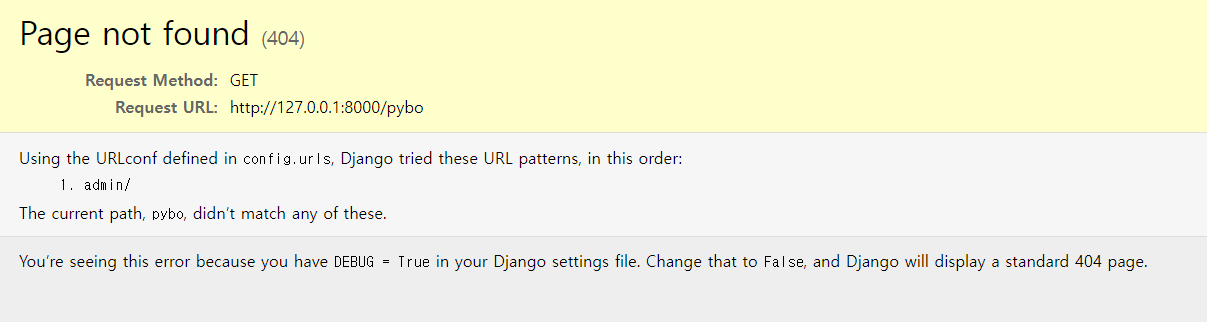 404오류가 발생했다. 404오류는 브라우저가 요청한 페이지를 찾을 수 없을 때 발생하는 오류다. 문구를 보면 config/urls 파일에 /pybo URL이 없다고 나온다. 오류를 해결하기 위해 당연히 config/urls.py에 /pybo URL에 대한 매핑을 추가해야 한다.