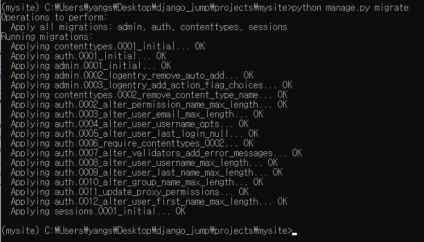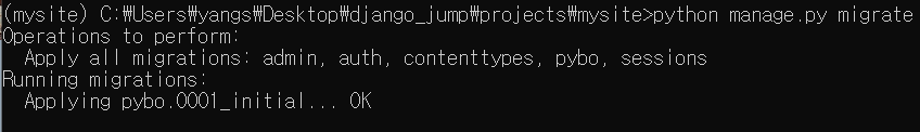 (mysite) C:\Users\yangs\Desktop\django_jump\projects\mysite>python manage.py migrate