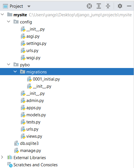 INSTALLED_APPS에 추가한 pybo.apps.PyboConfig 클래스는 pybo/apps.py에 있는 PyboConfig 클래스다. Pybo 앱 생성 시 자동으로 만들어진 파일이다. 해당 앱을 INSTALLED_APPS 항목에 추가하지 않으면 DB 관련 작업이 불가하다.