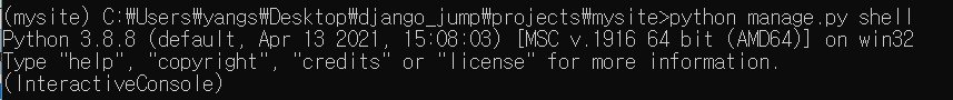 (mysite) c:\projects\mysite>python manage.py shell