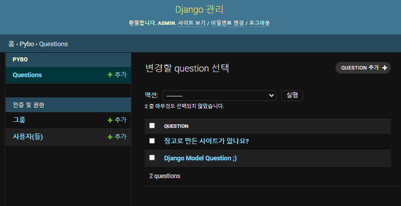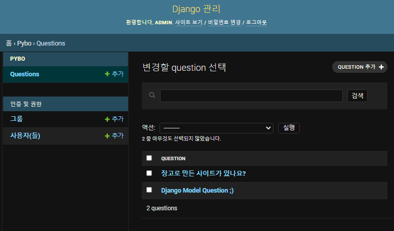 웹사이트를 새로고침하니 Pybo 앱에 Question이 등록된 것을 확인할 수 있다. 이제 장고 관리자 화면에서 Question 모델을 관리할 수 있다. 신규 질문 생성, 조회, 수정, 삭제도 가능하다.