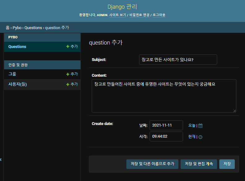 장고 관리자 화면