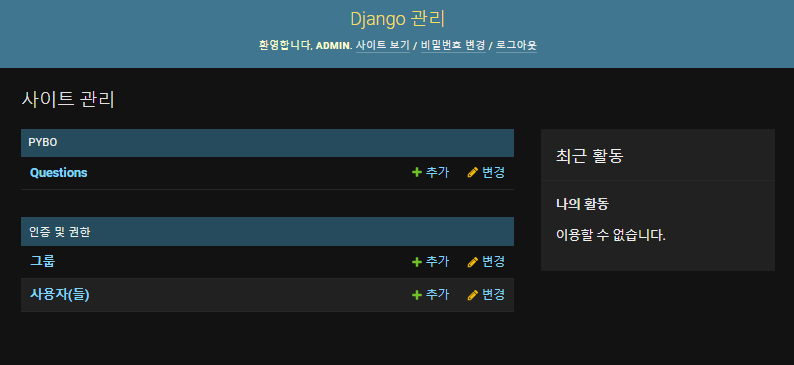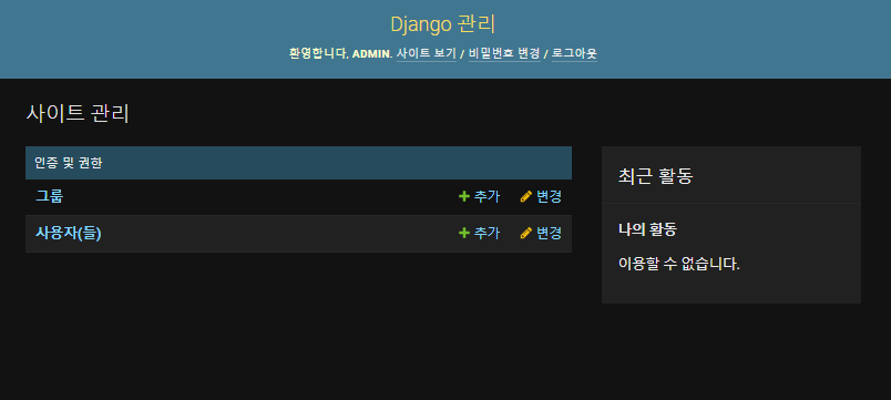 사이트 관리 화면이 나타났다. 상단에서는 사이트 보기(localhost:8000 주소), 비밀번호 변경, 로그아웃 메뉴가 있다. 그 아래에는 사이트 관리 메뉴들이 있는데 그룹과 사용자들의 인증 및 권한을 제어할 수 있다. 우측에는 최근 활동 이력을 나타내는 공간도 있다.