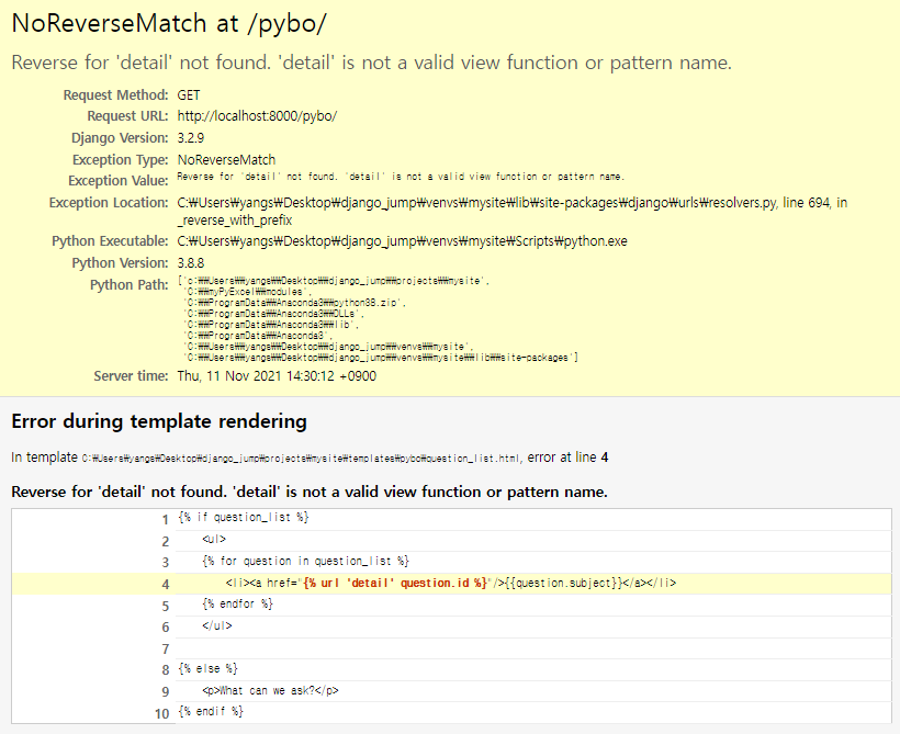 {% url ‘detail’ question.id %}을 {% url ‘pybo:detail’ question.id %}으로 바꾸어 주었다. Detail 앞에 pybo라는 네임스페이스를 붙여준 것이다.