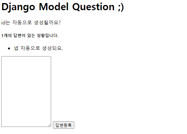중간에 답변 확인할 수 있는 영역을 추가했다. question.answer_set.count 는 답변의 총 갯수를 의미한다. 위와 같이 수정하고 상세 화면을 호출하면 아래와 같이 나온다.