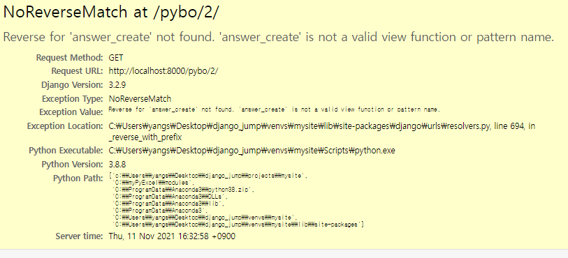 Answer_create 별칭이 없다는 오류가 발생했다. 왜냐하면 질문 상세 템플릿에 {% url ‘pybo:answer_create’ question.id %}과 같은 별칭을 사용했기 때문이다.