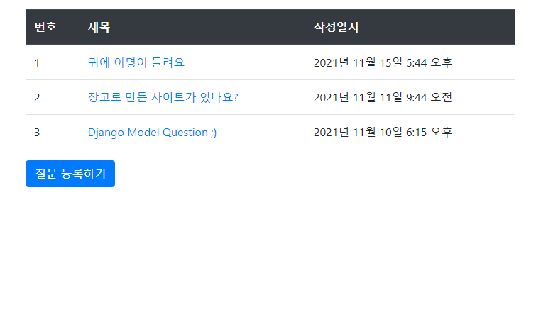 | (... 생략 ...) </table> <a href="{% url 'pybo:question_create' %}" class="btn btn-primary">질문 등록하기</a> </div> {% endblock %} |