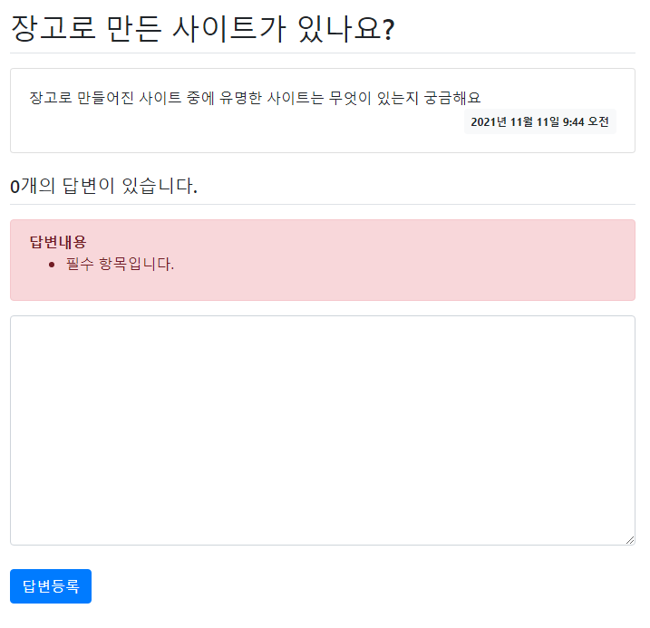 자, 이제 답변내용을 추가하지 않으면 아래와 같이 오류 메시지 창이 뜬다.