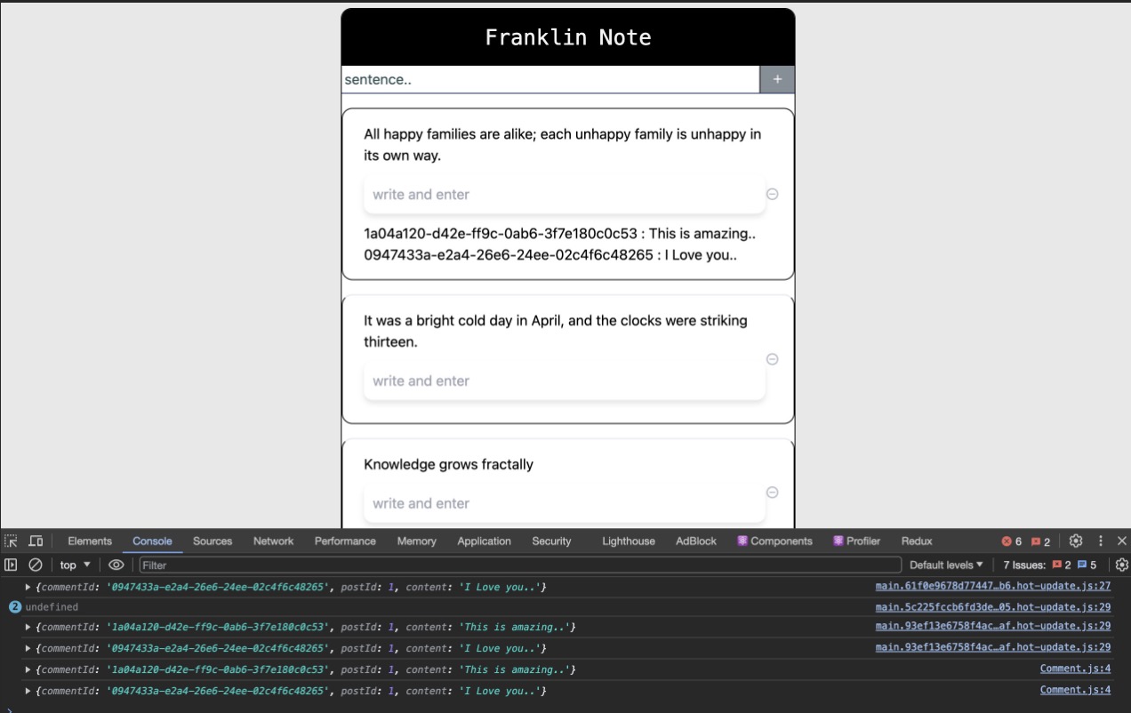 결국 이런걸 두루 고려했을 때 그냥 컨테이너 하나당 input 창 하나씩만 만들고, input창에서 댓글을 본래 가지고 오고 있던 데이터 notes의 상태에 댓글 데이터를 추가만 하는 식으로 데이터를 중앙집권적으로 관리하려 한다. 그렇게 되면 댓글 부분은 그저 렌더링만 하면 되기 떄문에 input의 value 상태를 복잡하게 고민할 필요가 없다.