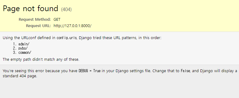 이는 ‘/’를 의미하는 http://localhost:8000/ 페이지에 대한 URL 매핑을 하지 않았기 때문이다.
