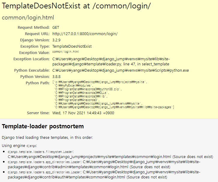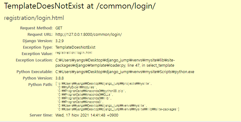 위와 같이 수정하면 registration 디렉터리가 아닌 common 디렉터리에서 login.html 파일을 참조하게 된다. 코드 수정 후 로그인 링크 누르면 여전히 오류 메시지나 난다. 그런데 오류 메시지가 조금 달라진 것을 알 수 있다.