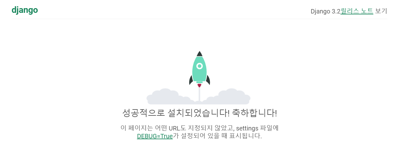 웹브라우저에서 localhost:8000(127.0.0.1:8000) 주소로 접속하면 성공적으로 장고 프로젝트가 생성된 것을 알 수 있다.