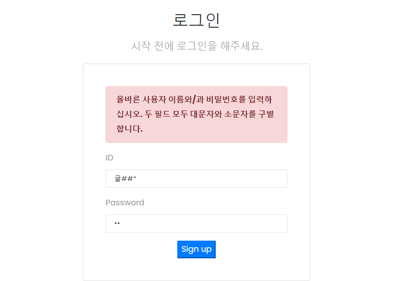 {자, 이제 화면으로 확인해보자. 비정상적인 아이디와 비밀번호를 입력하니 아래와 같은 오류창이 뜬다.