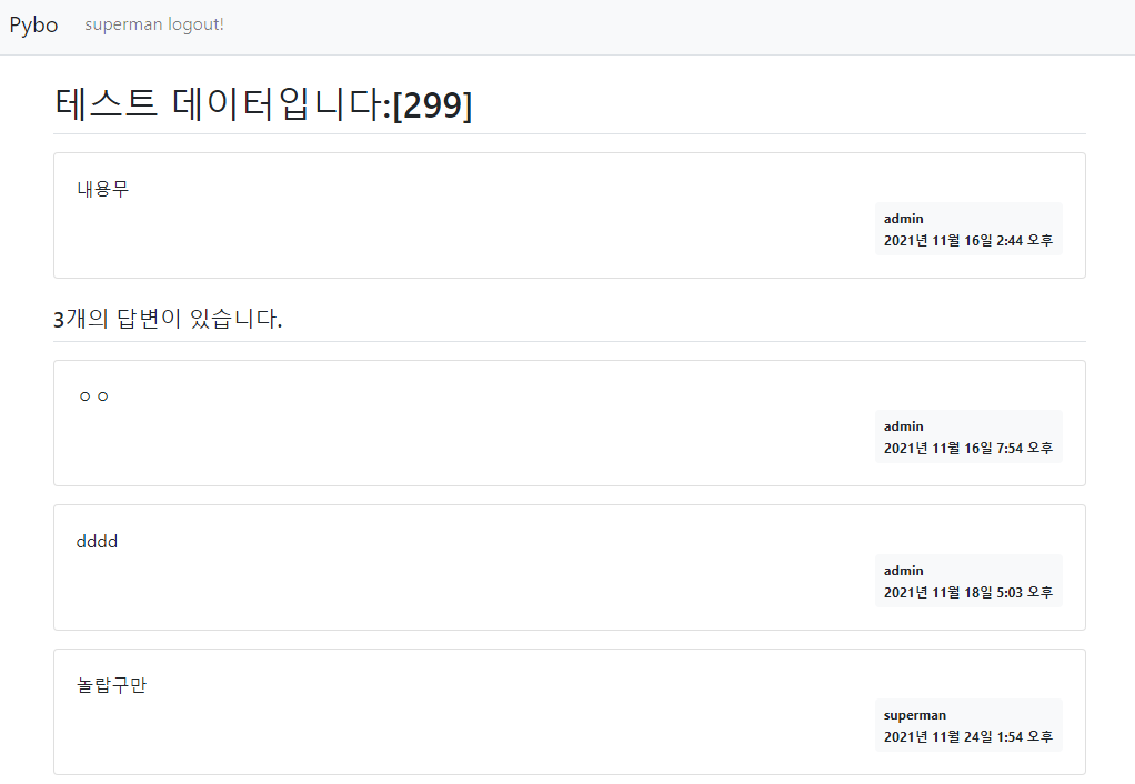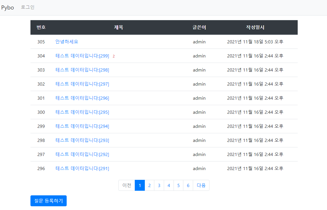 Question 모델과 Answer 모델에 author 속성 추가완료 했다. 게시판 게시물에 ‘글쓴이’ 표시하는 것이 일반적이다. 질문 목록, 질문 상세 화면에 author 속성을 이용해 글쓴이를 표시해보자.