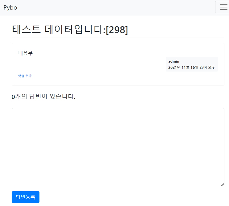 댓글을 등록할 때는 답변 id 번호(<int:answer_id>)를 사용했고, 수정하거나 삭제할 경우는 댓글의 id 번호(<int:comment_id>)를 사용했다.