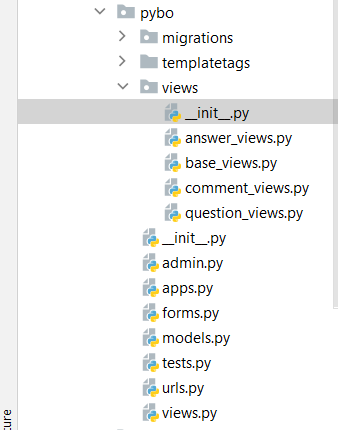 파일 작성이 끝났으니 pybo/views.py 파일을 삭제하자. 정리 후 views 디렉터리의 모습은 다음과 같다.