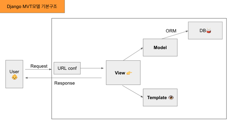 3. View Logic : View는 어떤 행동을 취할지에 대한 로직을 담고 있다. 그 로직이 어떤 모델(DB)와 어떤 Template(화면)을 어떻게 다룰지 명령한다.